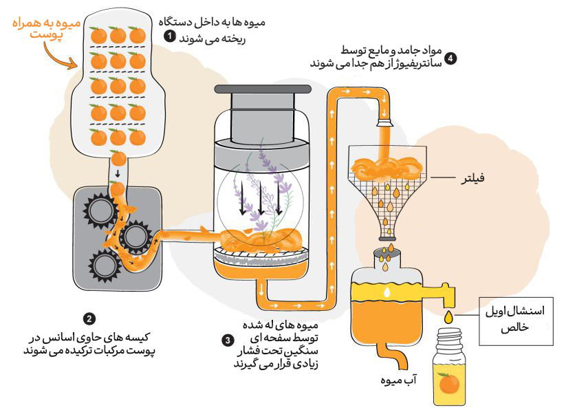 پس از برداشت، قسمتهای گیاه به کارخانه منتقل و اسانس از آنها استخراج می شود. کیفیت اسانس به طور قابل توجهی به فرآیند استخراج بستگی دارد. دو روش اصلی برای استخراج اسانس وجود دارد: تقطیر و پرس سرد. هدف اصلی هر یک از این روشها جداسازی اسانس طبیعی از اجزای گیاه برای تبدیل آن به محصولی قابل استفاده است. تقطیر و پرس سرد فرآیندهایی آلی هستند که به ترکیبات معطر اجازه می دهد تا به آرامی از اجزای گیاه جدا شوند و در عین حال ترکیبات شیمیایی قوی و ظریف اسانس را نیز حفظ کنند.